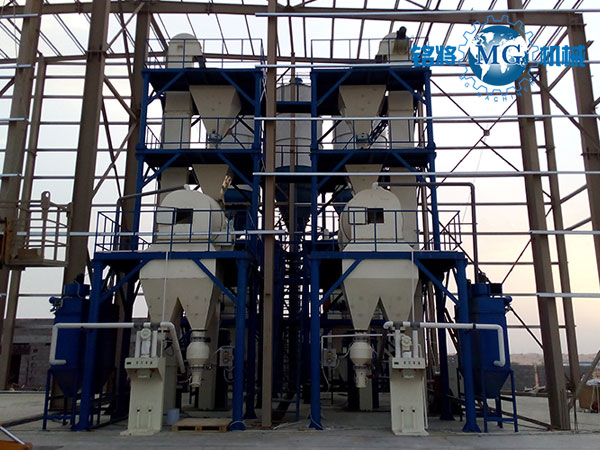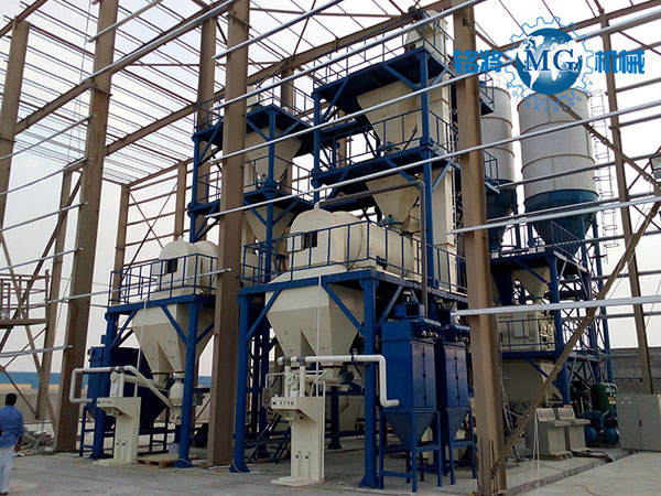 鄭州銘將機械設備有限公司研發生產的全自動保溫砂漿生產線,一般情況下會用到4-6個原料罐,兩個大罐用于裝放散裝水泥和粉煤灰,其余小罐用于裝放輕鈣、重鈣、砂、小料等。散裝水泥和粉煤灰進罐不需要提升設備,依靠泵車打入。輕鈣、重鈣、砂、小料等需要使用斗式提升機提入小罐,巧妙的物料分配系統支持一個斗式提升機分配式作業,從而避免了資源浪費。計量系統在計量螺旋的配合下,把料倉中的原料導入計量倉,通過傳感器的數據反饋,實現原料計量。計量好后的物料,通過螺旋輸送機導進主斗提機,提升到混合機上部待混料倉中。待混倉為氣動大開門型,可以迅速將待混物料放入無重力混合機,實現保溫砂漿連續生產。